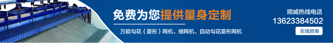 | 安平縣順威絲網(wǎng)機(jī)械設(shè)備制造有限公司自產(chǎn)自銷(xiāo),省去中間環(huán)節(jié),讓利給客戶(hù),真正的讓您省錢(qián)。主要產(chǎn)品有:萬(wàn)能勾花(菱形)網(wǎng)機(jī)、縮網(wǎng)機(jī)、自動(dòng)勾花菱形網(wǎng)機(jī)、全自動(dòng)勾花菱形網(wǎng)機(jī)。 |